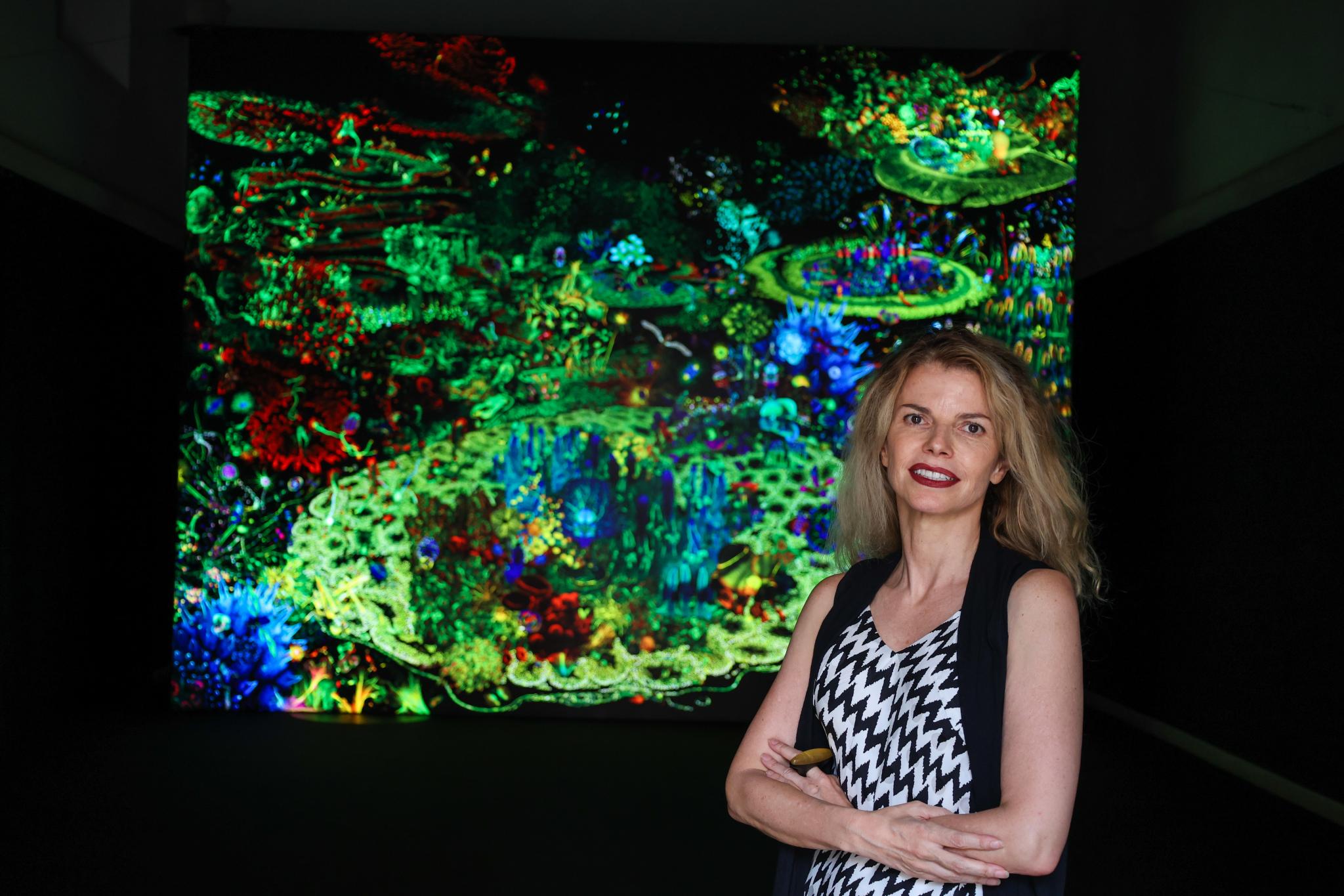 «El Jardín de las Delicias» no es una exposición al uso. Estamos ante una muestra que exhibe una única obra, impactante por sus dimensiones (6 x 4,5 metros) e innovadora por su características técnicas, ya que está compuesta por centenares de imágenes científicas del campo de la biomedicina que estudian con el microscopio diferentes episodios y estados vitales. Una composición que firma la artista Anna Rierola (Barcelona, 1969) y que deslumbra nada más cruzar el umbral del Espai Sant Josep de Ciutadella. El «lugar perfecto», una antigua iglesia gótica, para exhibir «un retablo contemporáneo», defiende la autora, que por primera vez expone en la Isla con un discurso que combina el arte con la ciencia.