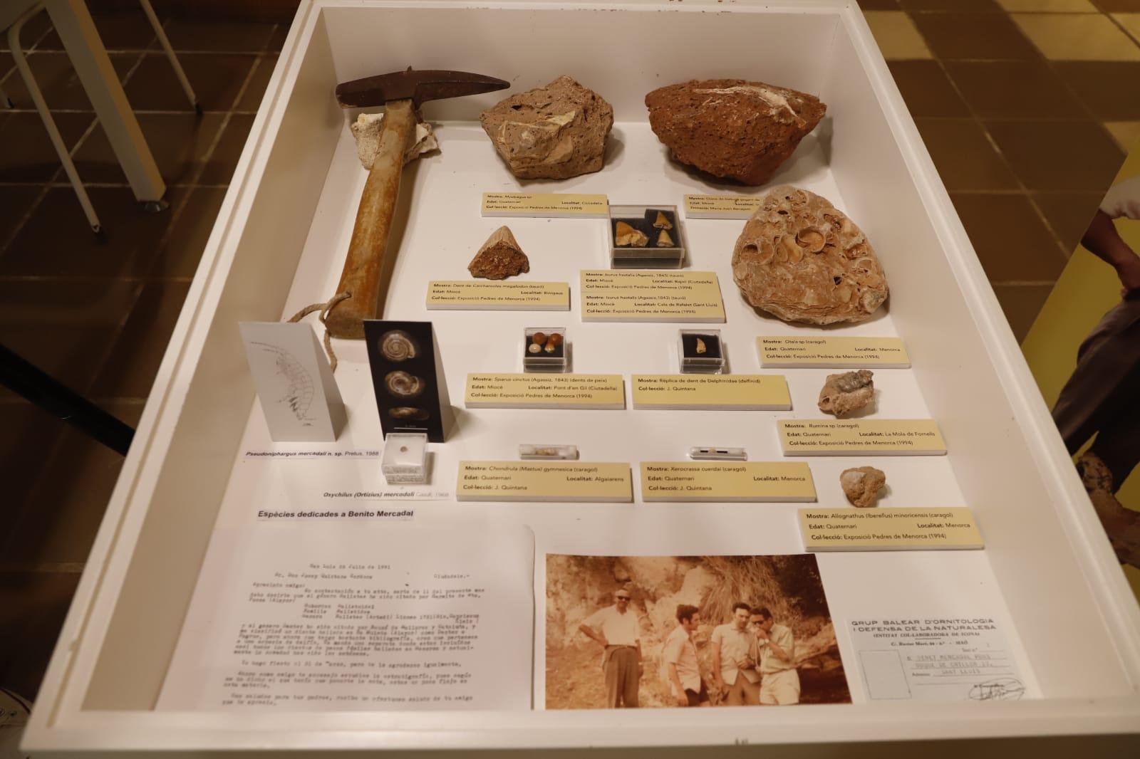 Dents de tauró megalodon de fa més de cinc milions d’anys trobats a Binigaus (Es Migjorn Gran), ossos de tortuga gegant de Menorca recollits a Son Olivaret (Ciutadella) i fins i tot un fòssil del desaparegut mamífer menorquí myotragus –una mena de cabreta–, junt amb altres fòssils, fotografies i documents de Benito Mercadal Pons, es mostren des d’aquest divendres a una nova vitrina de la col·lecció permanent del Centre de Geologia de Ferreries.