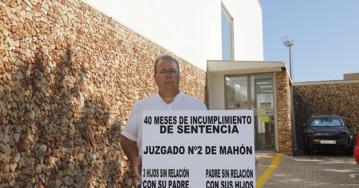 El fallo fue dictado por el tribunal balear en noviembre de 2019, pero no se ejecuta desde marzo de 2020, asegura el progenitor. Es por eso que se plantó en el juzgado con una pancarta en la que recogía la denuncia por su situación: «40 meses de incumplimiento de sentencia, Juzgado número 2 de Mahón, 3 hijos sin relación con su padre, padre sin relación con sus hijos», rezaba el mural que sujetaba frente a la sede judicial a primera hora de la mañana.