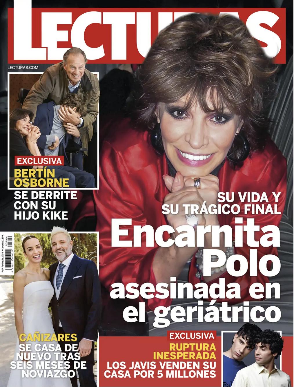 Lecturas también centra su atención en la muerte de Encarnita Polo, con el titular «Asesinada en el geriátrico», en un reportaje firmado por Mayka Navarro. Bertín Osborne aparece junto a su exmujer, Fabiola Martínez, abrazando a su hijo Kike, mientras vuelve a mencionarse la boda exprés de Santiago Cañizares. En el faldón, se informa de la separación de Los Javis y de la próxima venta de su vivienda, tasada en cinco millones de euros.