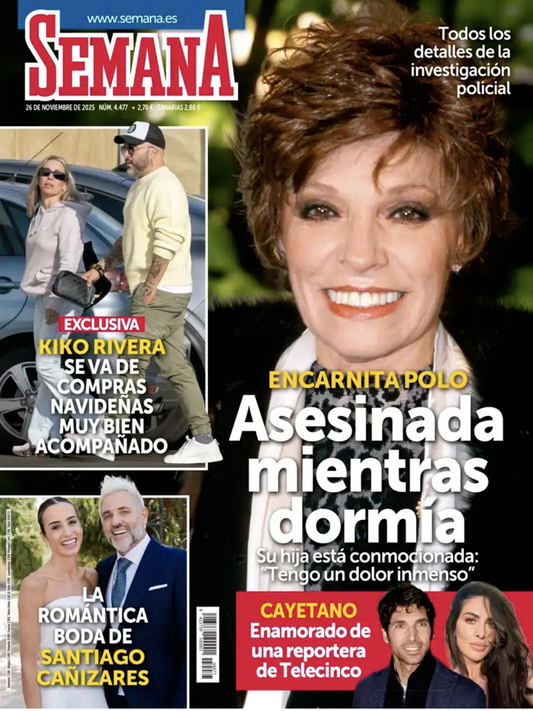 Semana aborda de forma contundente en su portada el fallecimiento de Encarnita Polo con el titular: «Asesinada mientras dormía». Su hija expresa un dolor inmenso y la revista incluye datos de la investigación. También muestra imágenes de Kiko Rivera en una jornada de compras acompañado por una joven rubia y ofrece acceso exclusivo a la boda de Santiago Cañizares. En la parte inferior, destaca la noticia de que Cayetano Rivera mantiene una relación con una periodista de Telecinco.