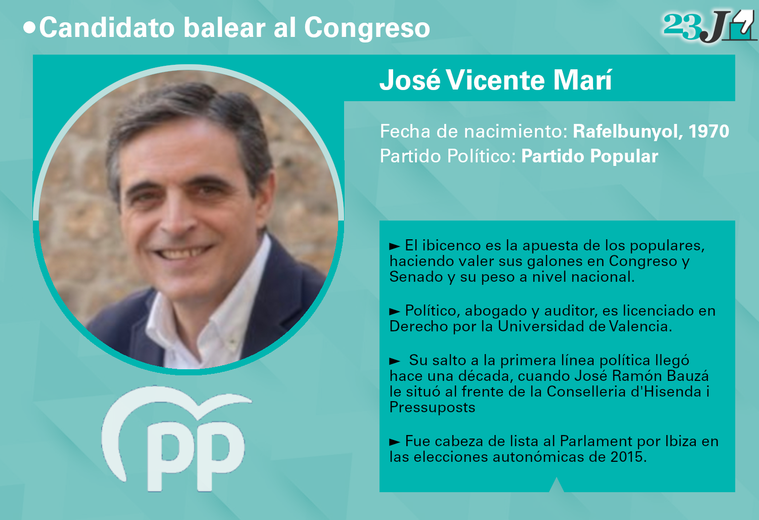José Vicente Marí Bosó (Rafelbunyol, Valencia, 1970) es el candidato del Partido Popular con experiencia en el Congreso y el Senado. Es licenciado en Derecho por la Universidad de Valencia (1997), además de miembro del Instituto de Censores Jurados de Cuentas de España, es hijo de Antoni Lluís Marí, quien fuera presidente de Sa Nostra. Su salto a la primera línea política llegó hace una década, cuando José Ramón Bauzá le situó al frente de la Conselleria d’Hisenda i Pressuposts en mayo de 2013, en un momento delicado a nivel económico.