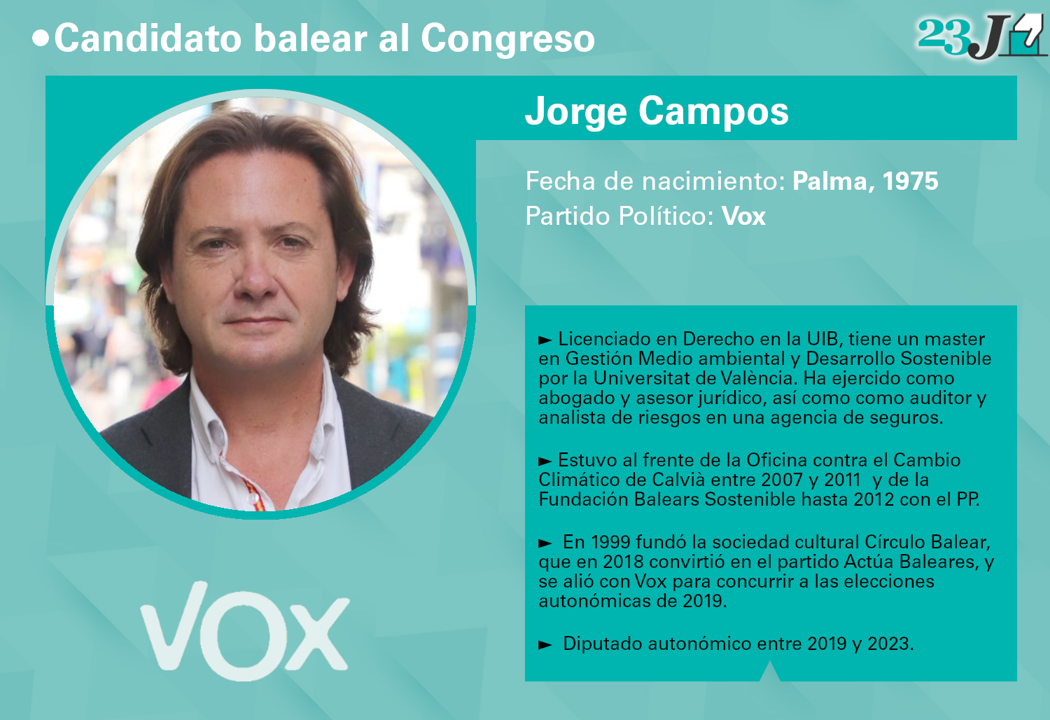 Jorge Campos estudió en el colegio La Salle de Palma, se graduó en Derecho en la UIB en 1998 y tiene un master en Gestión Medio ambiental y Desarrollo Sostenible por la Universitat de València. En su carrera laboral ha ejercido como abogado y asesor jurídico, así como como auditor y analista de riesgos en una agencia de seguros. Nunca llegó a ser militante del Partido Popular, pero el candidato de Vox siempre fue una persona muy próxima a Carlos Delgado, ex alcalde de Calvià y ex conseller de Turismo. Este lo colocó al frente de la Oficina contra el Cambio Climático de Calvià entre 2007 y 2011, luego lo nombró director de la Fundación Balears Sostenible en el Ejecutivo de José Ramón Bauzá. Campos abandonó la Fundación en mayo de 2012 por «discrepancias ideológicas» con el Govern, sobre todo en temas lingüísticos.
