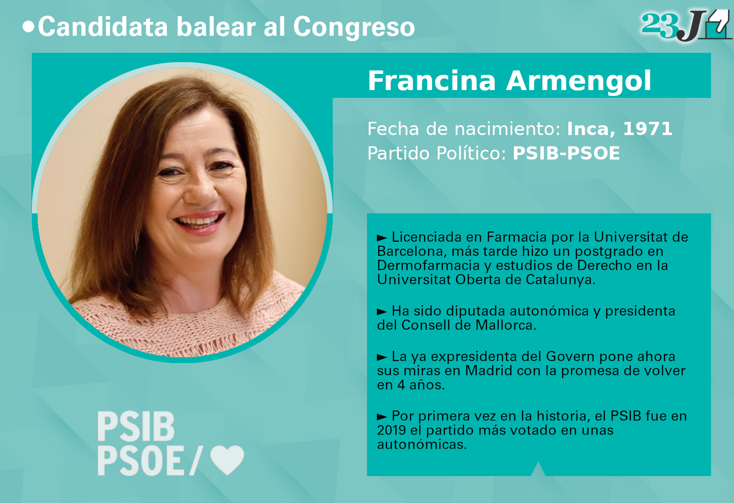 Francina Armengol (Inca, 1971), la primera mujer presidenta de Baleares durante ocho años, levanta el vuelo y pone sus miras en el Congreso de los Diputados, un periplo político similar que han llevado a cabo otros líderes territoriales. Estudió Farmacia en la Universitat de Barcelona, y más tarde hizo un postgrado en Dermofarmacia y estudios de Derecho en la Universitat Oberta de Catalunya. Después de completar su etapa universitaria, trabajó en la farmacia de su familia hasta 1999, al tiempo que iniciaba su carrera política.