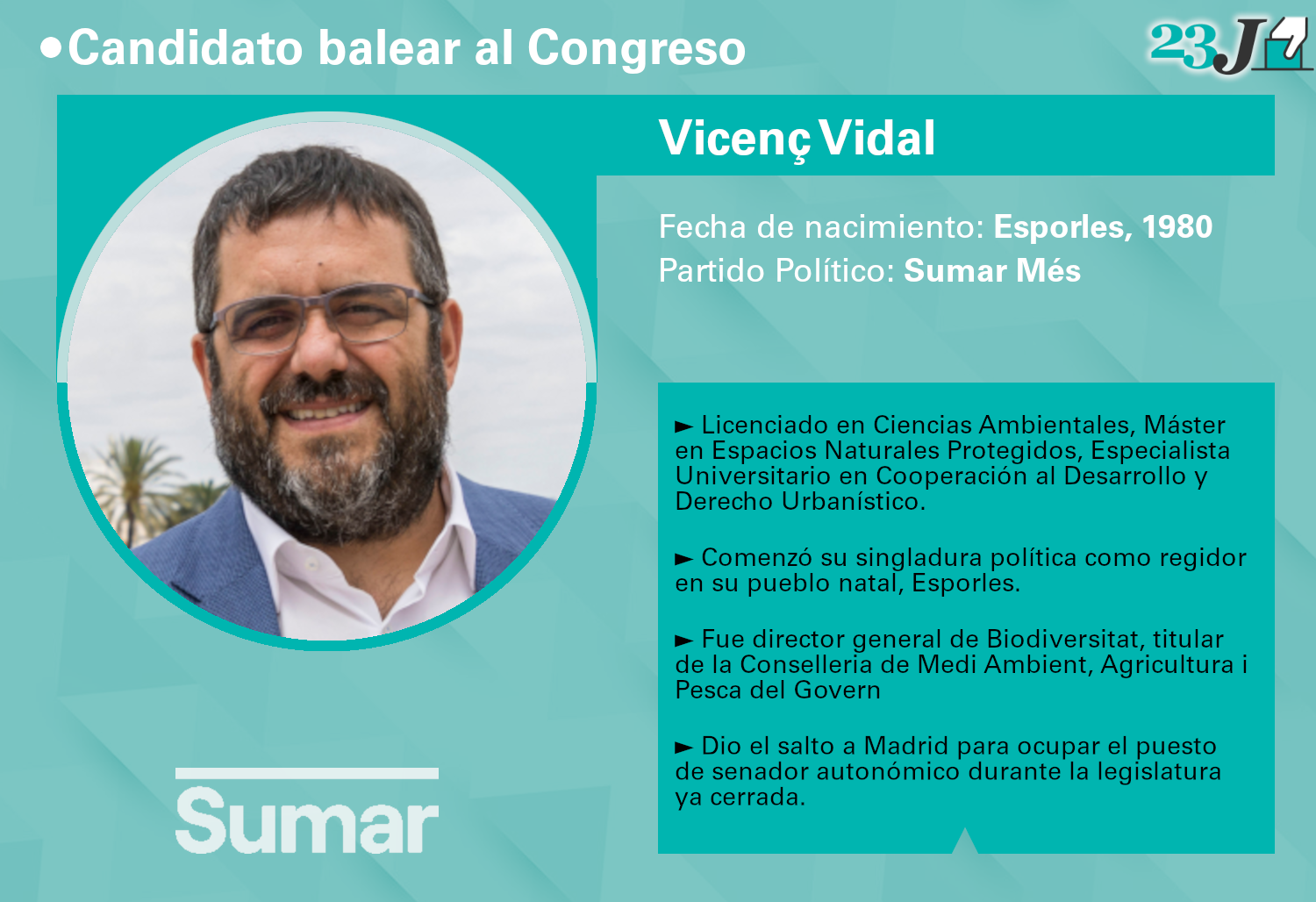 Bajo el paraguas de Sumar, avalado por Yolanda Díaz y como apuesta de Més, Vicenç Vidal Matas (Esporles, 1980), hasta ahora senador autonómico por Baleares, aspira a hacer historia logrando un escaño para las islas en el Congreso como rostro de la entente ‘Sumar Més’. Licenciado en Ciencias Ambientales (Universitat Autònoma de Barcelona, 2003), Máster en Espacios Naturales Protegidos, Especialista Universitario en Cooperación al Desarrollo (UIB, 2012) y Derecho Urbanístico, comenzó su singladura política como regidor en su pueblo natal, Esporles (2007-19).