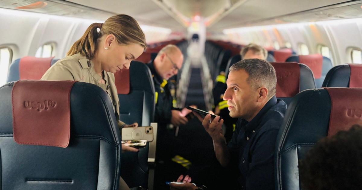 La presidenta del Govern, Marga Prohens; el director de Emergencias e Interior, Pablo Gárriz, y el equipo técnico que les acompaña no han podido bajar del avión en Ibiza debido a las fuertes lluvias, por lo que han tenido que asistir a la reunión del comité técnico desde la aeronave.