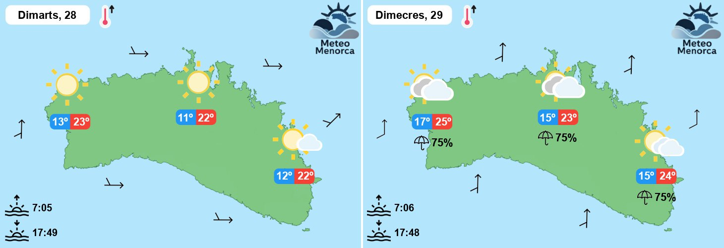 Després d’un diumenge plujós i amb una baixada dràstica de la temperatura, l’inici de la setmana serà en general estable a Menorca, amb un ambient més assolellat i temperatures que tendiran a pujar una mica, especialment a les hores centrals del dia. Dilluns i dimarts la presència d’altes pressions al nord afavorirà un temps tranquil, amb cels clars o només amb alguns intervals de nivolats prims i vent fluix, predominant del sud i de ponent.